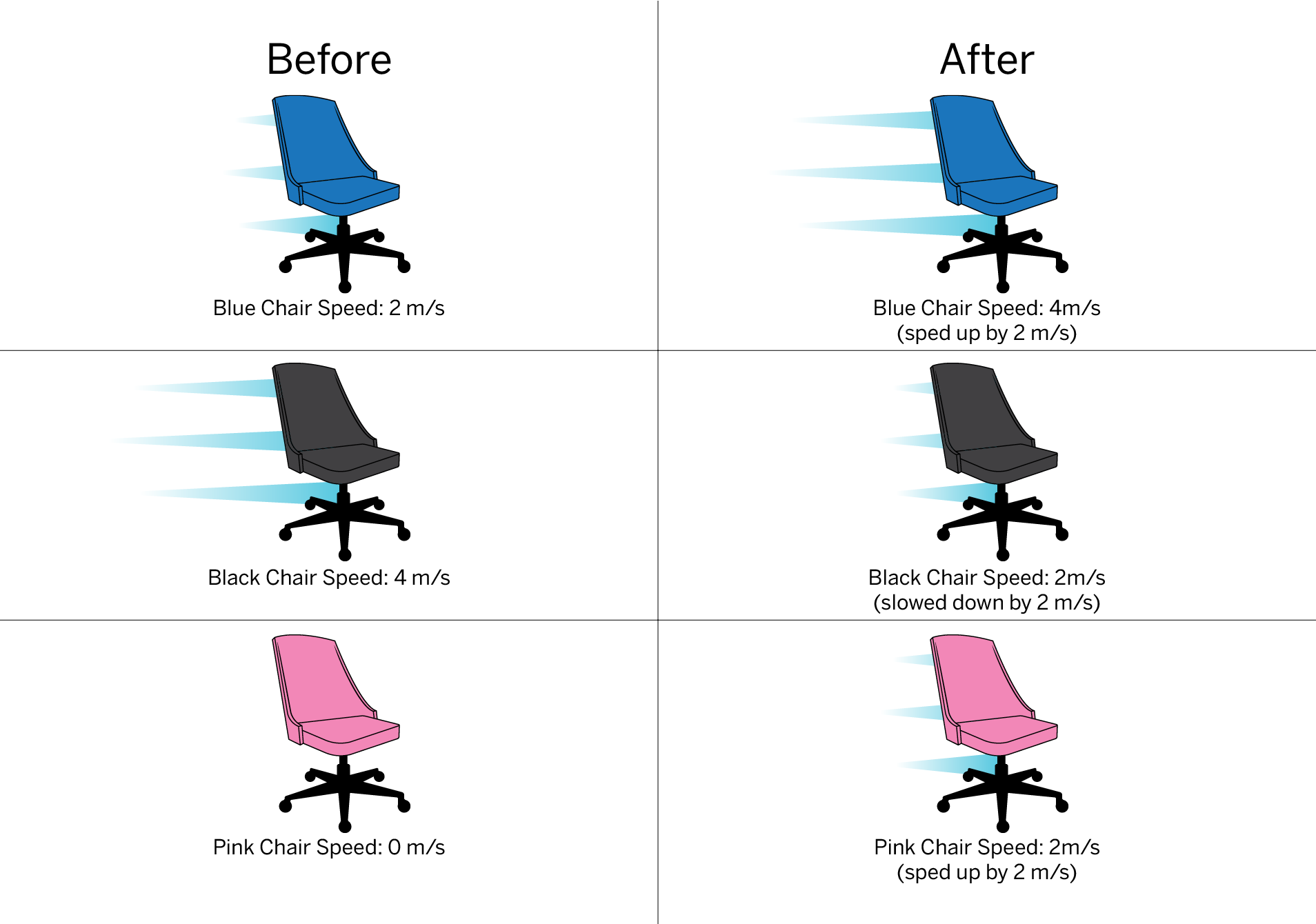 Alfonso, Julia, and Margie were having fun as they rolled some office chairs across a flat floor. All three chairs have the same mass. Margie gave each of the chairs a push, but not all from the same direction. Each chair changed speed as a result of being pushed. Use the information in the diagram to answer.