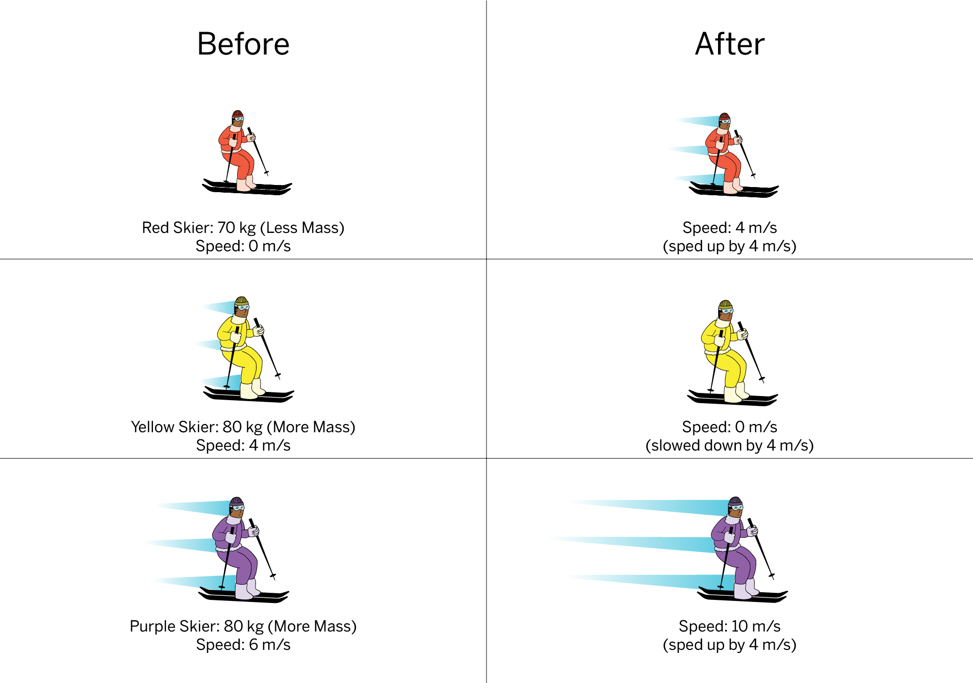 Three skiers were racing across flat, smooth snow. The skiers in yellow and purple sweaters have the same mass, which is more mass than the skier in the red sweater. Each skier was bumped by another skier, but not from the same direction. Use the information in the diagram to answer.