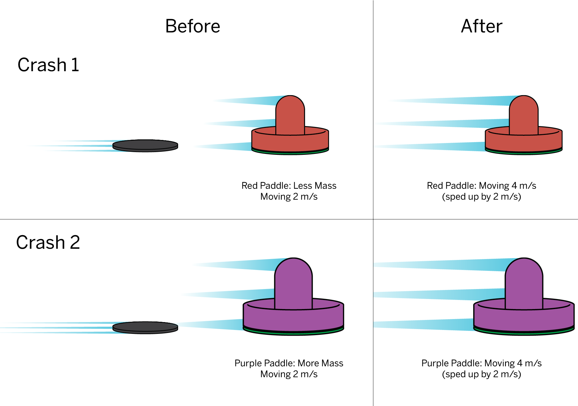 3. Alice and Kai were playing air hockey, which is a game where players hit a puck with paddles so the puck slides across a table. After the game, they were crashing the puck and two different paddles. The puck was the same in both crashes, but the paddles were different: the red paddle had less mass, while the purple paddle had more mass. Use the information in the diagram to answer.