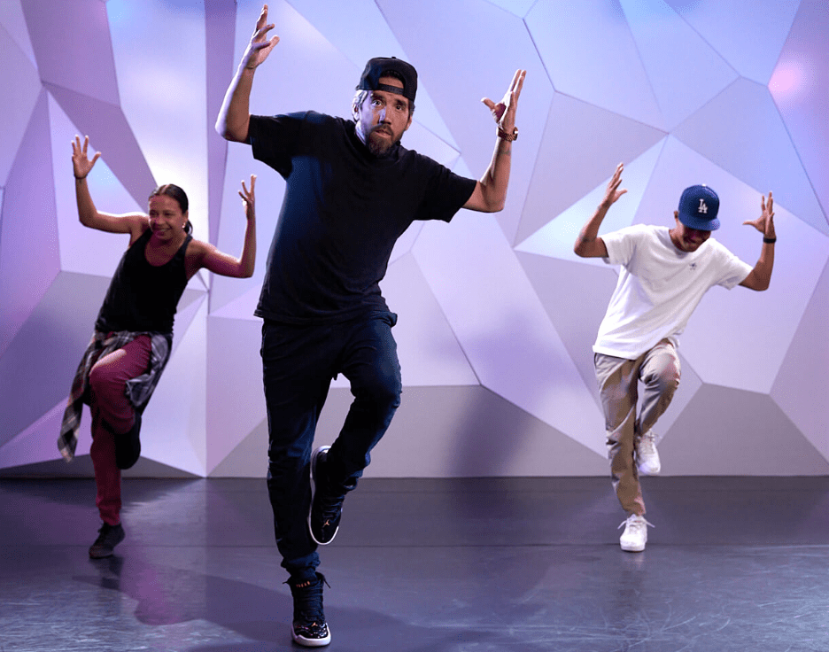 Focusing on the LEFT side of the dancer in the centre, name the position of the spine, thumb, knee, hip, and ankle.