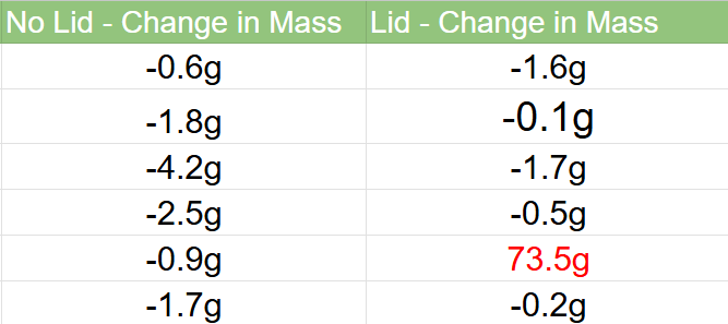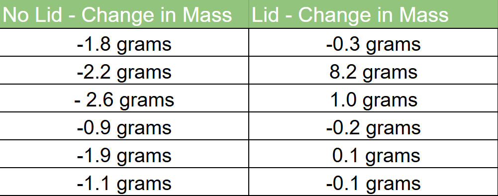 What is +1.45 grams (Lid) and -1.75 grams (No Lid)?