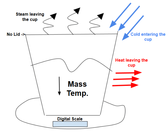 What is "a no lid cup of hot water losing temperature over time due to steam and heat leaving the cup and colder outside air?"