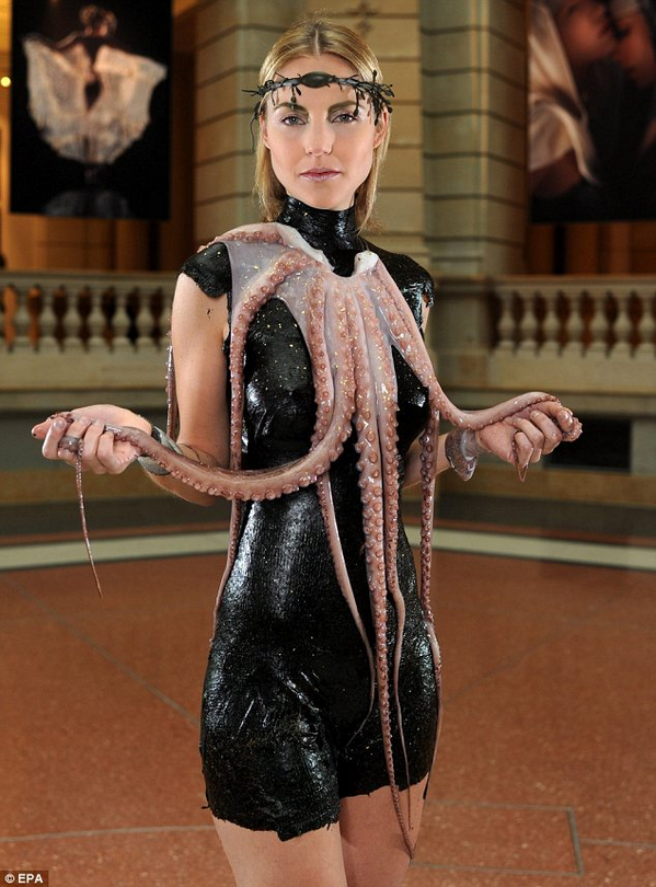Denne flotte tangkjole med tilhørende blæksprutte halskæde blev præsenteret til et modeshow i hvilken by?