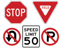 Stop sign, yield sign, No U-turns, Speed limit sign, and no parking.