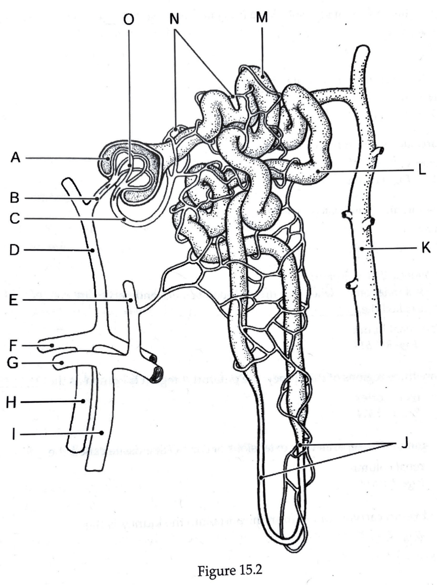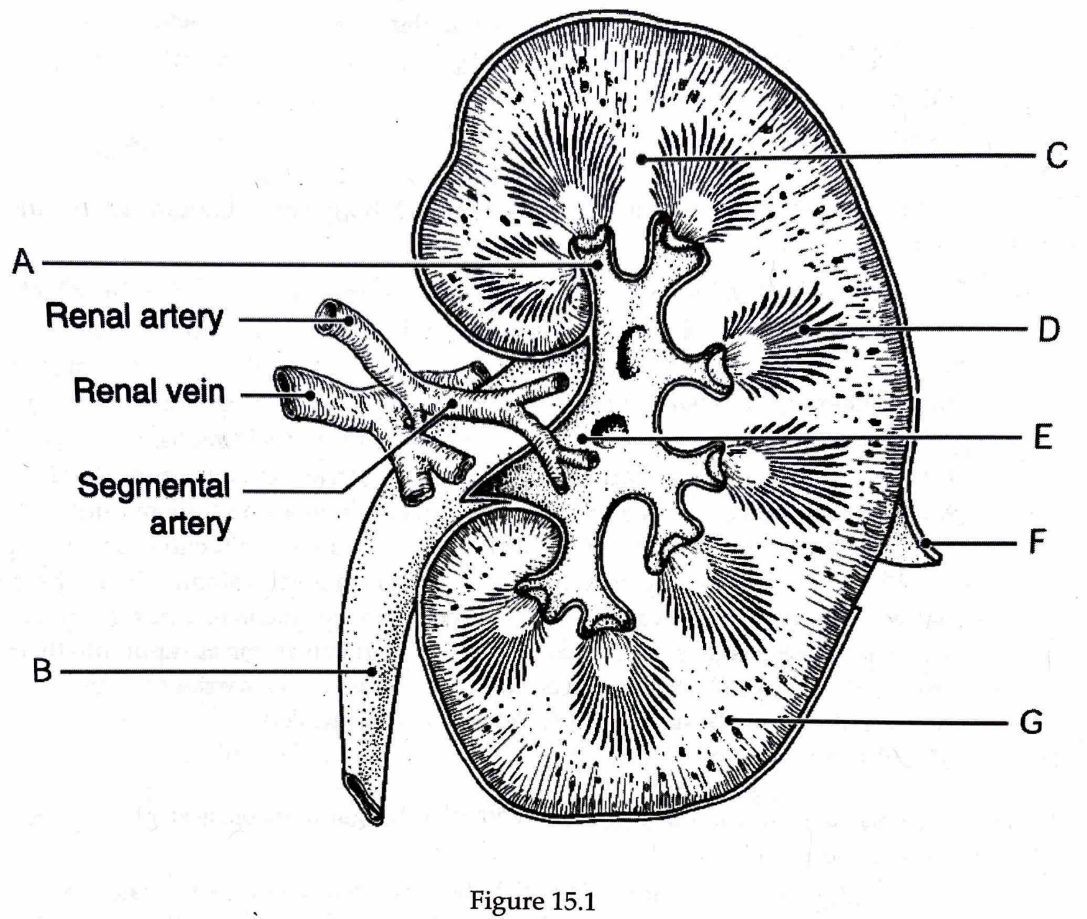 Which letter refers to the structure that is in charge of filtration?