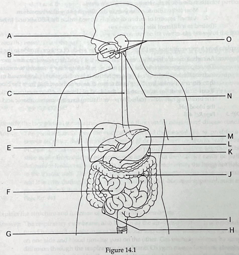 Which letter refers to the organ that HOLDS bile?