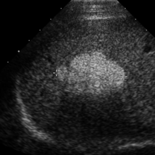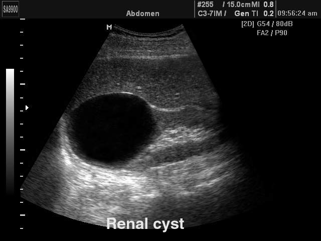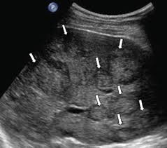 Describe the Pathology seen in the right kidney (Use sonographic terminology)