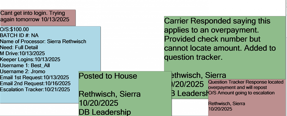 Too many sticky notes. Sticky notes do not need to be added for carrier or question tracker responses.