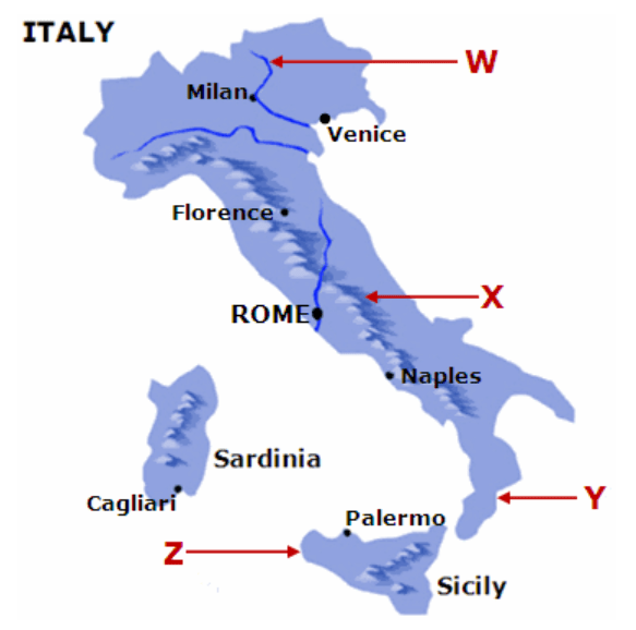 The picture shows a map of Italy. Which arrow points to a mountain?