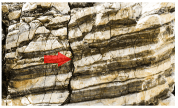 The picture below shows a large rock formation. The arrow points to a part of the formation that has changed. What is the best explanation of these changes?