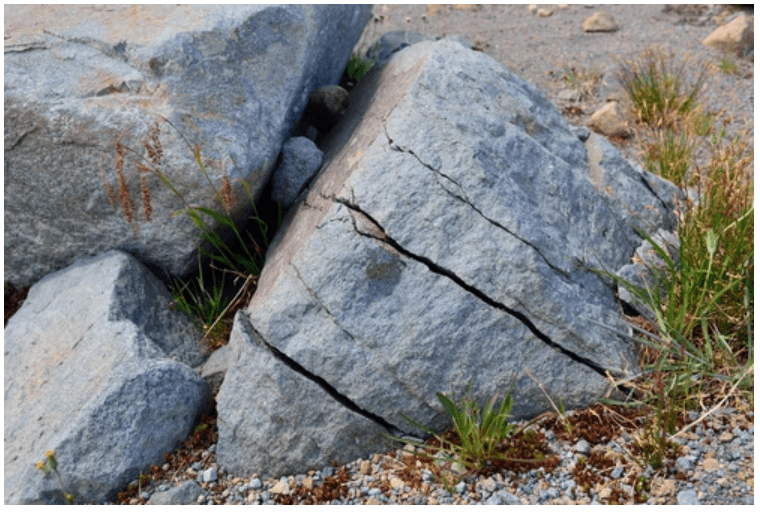 The cracks in this rock were made by ice. Water went into small cracks and froze. When the ice formed it pushed the rock apart. This happened many times, and each time the cracks got bigger.
