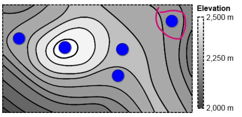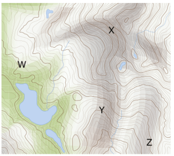Carlee is using the map below to plan a camping trip. Carlee wants to set up her tent on flat land. Which point on the map shows the flattest land?
