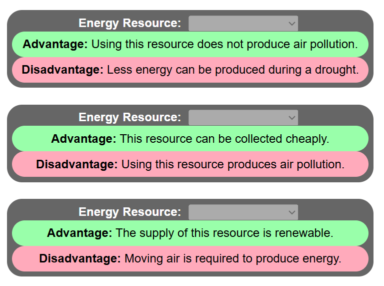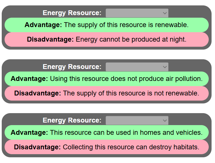 Each table describes a different energy resource. Determine the name of the resource that best fits the description in each table.