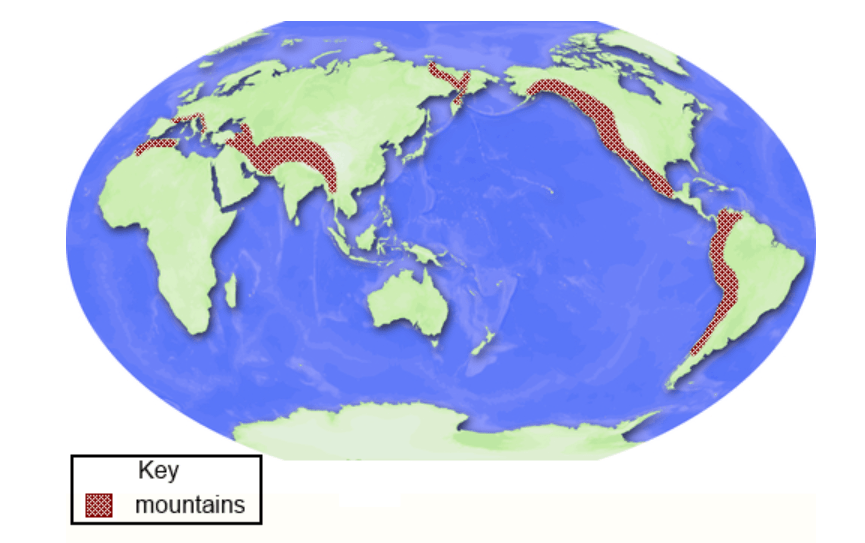 The map below shows the location of some of the major mountains of the world. Based on the map, what statement is true about the location of the mountains?