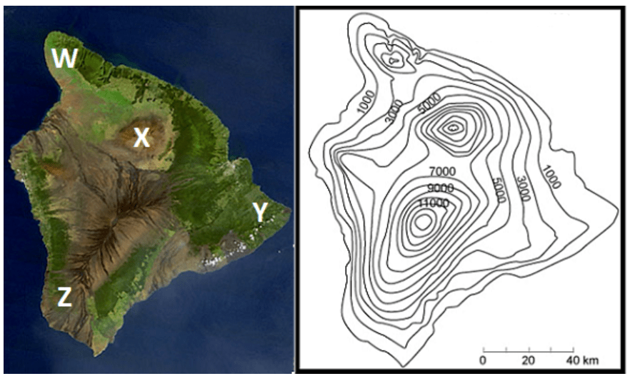 A satellite image and a topographic map of the island of Hawaii are shown below.