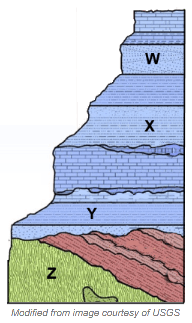 In the picture, layer W is 100 million years old and layer Z is 500 million years old. How old is layer X?