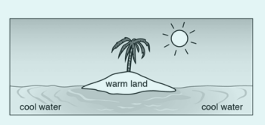 In the image above, the wind blows (towards/away) from the land in a (circular/straight) path.