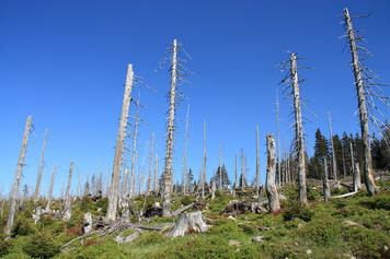 Look at the trees in this photo. They have been damaged by acid rain. Which interactions within the Earth systems does this photo illustrate?