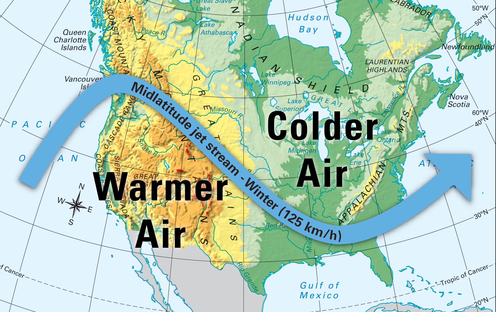 The prevailing winds in the United States generally move from west to east. They also can dip farther north or south, bringing changes in temperature and weather conditions. The map shows the path of the prevailing wind called the “jet stream” as it dips over the United States during a typical winter. What effect do you predict the prevailing wind would have if its path shifted farther north during the winter months?