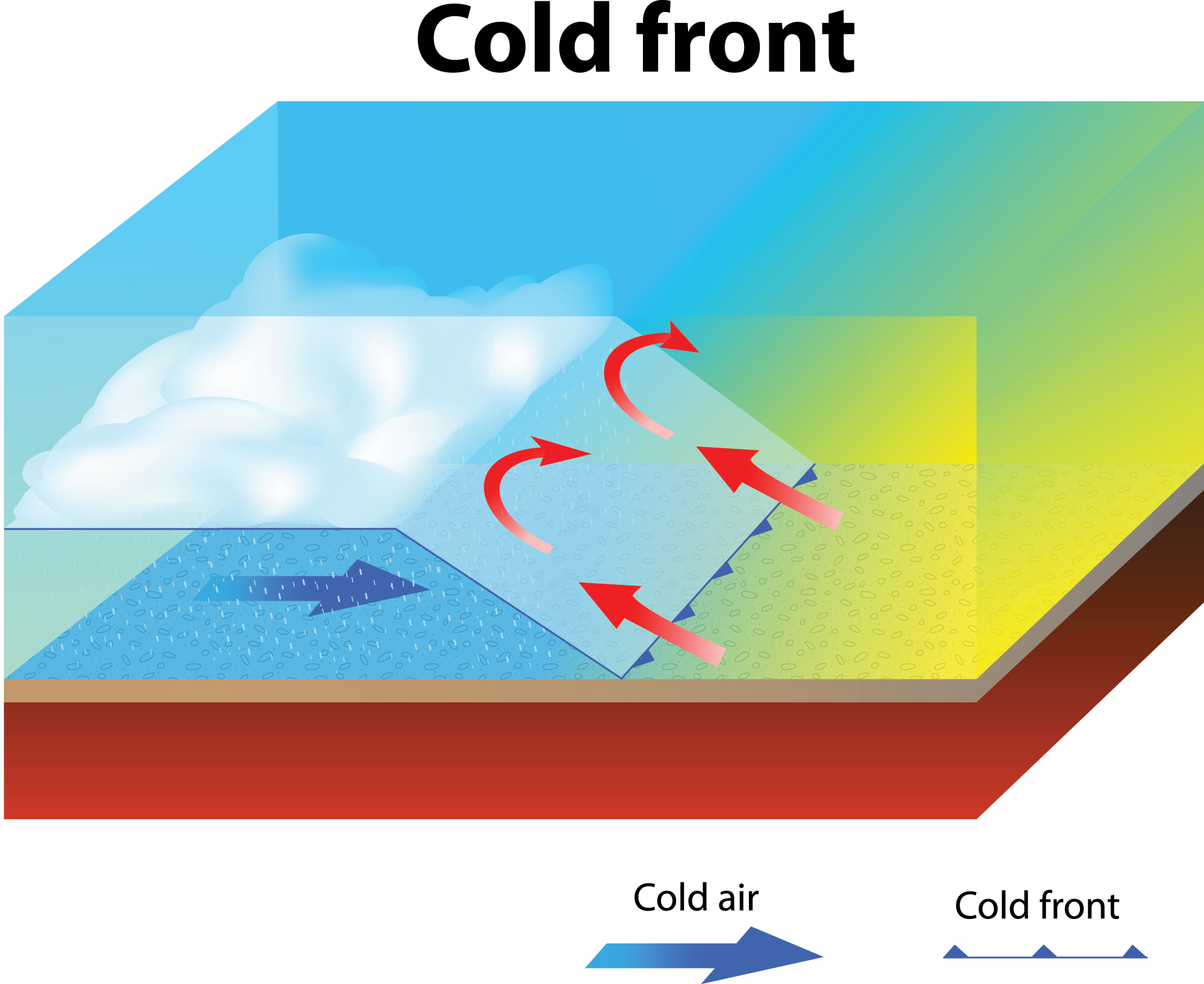 You have been enjoying warm weather when the weather station shows a map modeling an air mass moving toward your area. Look at the weather map. It has a row of blue triangles to represent the front where a cold air mass is moving toward a warm air mass. When the air masses meet, _________.