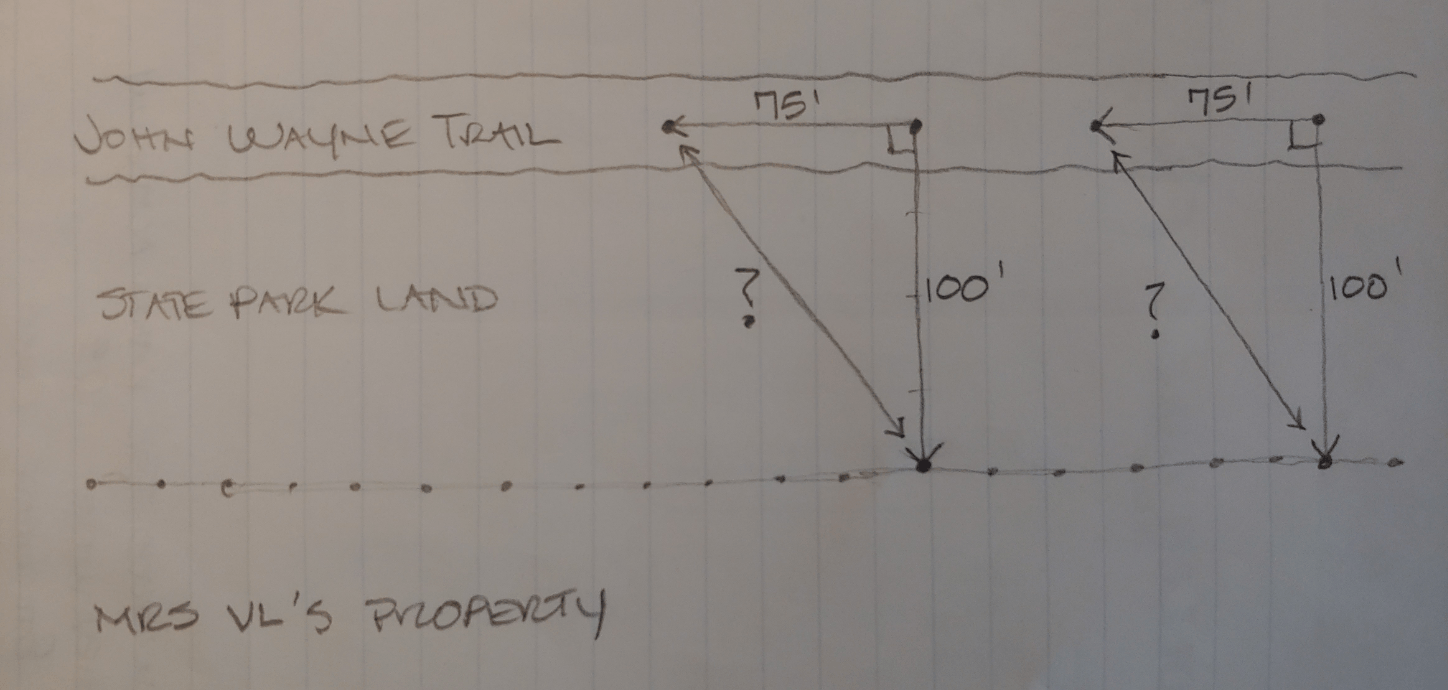 Zach was trying to find and mark a property boundary parallel to and 100' from the John Wayne Trail. From a point on the trail he measured 100' toward the property. He also measured 75' down the trail. If the angle these two lengths create is 90-degrees, how long will the hypotenuse connecting the ends of these lines be?