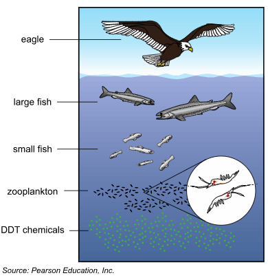 DDT chemicals were taken in by the zooplankton, which were eaten by small fish, which were eaten by large fish, which were eaten by eagles.