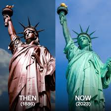 The Statue of Liberty gifted to the United States by the French was originally a copper color, however, this chemical reaction occurred over time that gave our Lady her iconic green colored exterior.