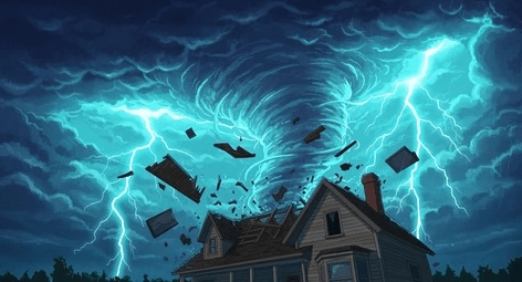 Artwork of a tornado pulling shingles off of a house best demonstrates