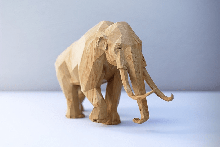 False: The elephant is 3D and so it's a form and not a shape, it's carved in wood and so it demonstrates actual course texture.