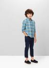 The boy is wearing a checked shirt and tight jeans.