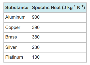 Platinum (it has the lowest specific heat)