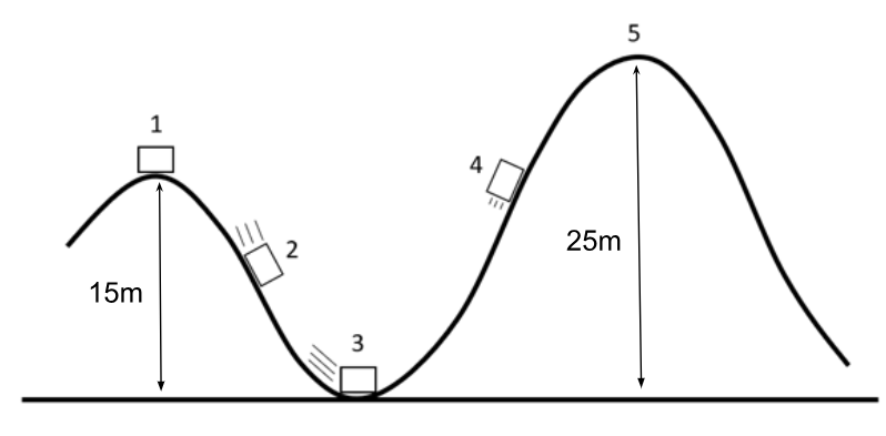 A skier with a mass of 70 kg starts at the top of a hill (point 1) with a height of 15 m from rest. The skier wants to reach the top of a ramp that is 25 m high (point 5). Assume there is no friction or air resistance. Will he be able to make it to the top of the ramp on the other side?