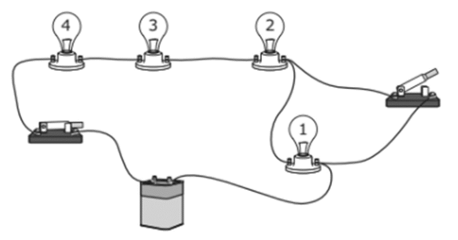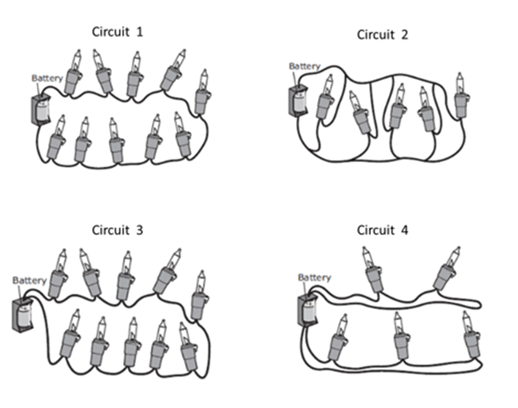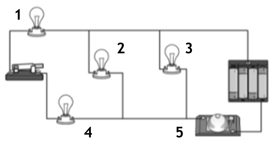 Identify the two complete circuits. Then explain how you know those are the two circuits with electrical energy flowing through them.