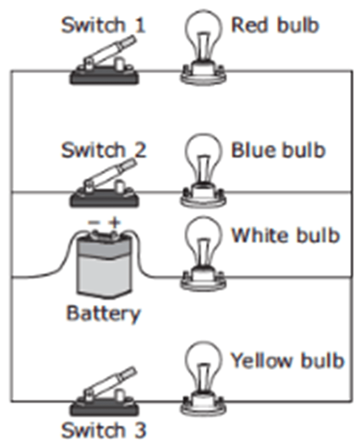 Examine the circuit. What procedures, or steps, are needed so that only the blue light bulb and white light bulb are on?