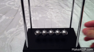 Describe how energy moves when you release one of the spheres in a Newton's cradle using the words TRANSFER and COLLISION.