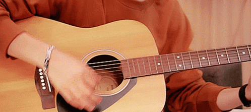 Sound energy transfers through waves created by vibrations when someone plays a guitar so it reaches your ears.