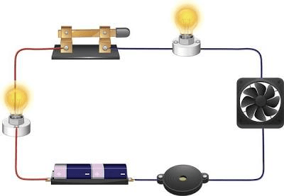 When all switches in the circuit below are closed, starting with the battery, what is one energy transformation that occurs?