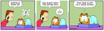 4. The cat (Garfield) is happy that he slept so long and says the year is off to a good start.