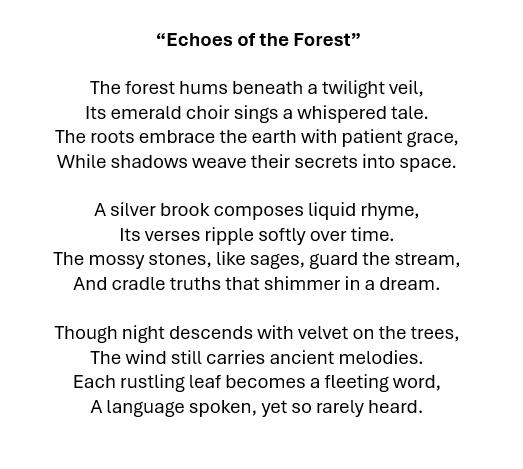 Explanation: A “veil” is something that covers or hides, so the poet makes the forest seem secret and mysterious at twilight.