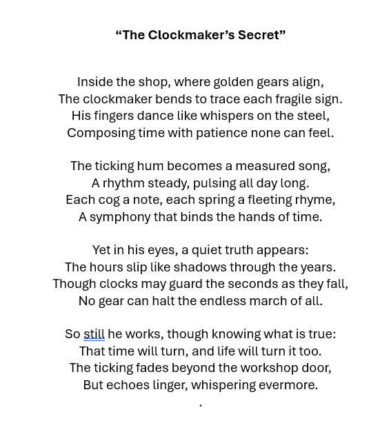 Which statement best expresses the theme of the poem “The Clockmaker’s Secret”?