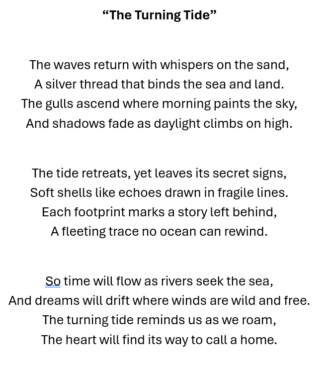 Correct answer: D) D) “The waves return with whispers on the sand.”