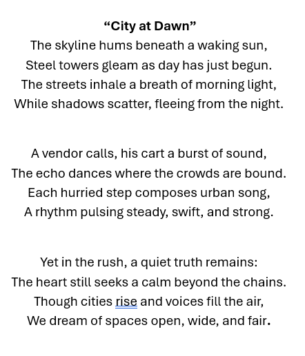 Explanation: “Inhale” means to breathe in, so the poet makes the streets seem alive and waking up as the day begins.
