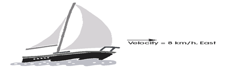 A sailboat is moving at a constant velocity of 8 km/h eastward.