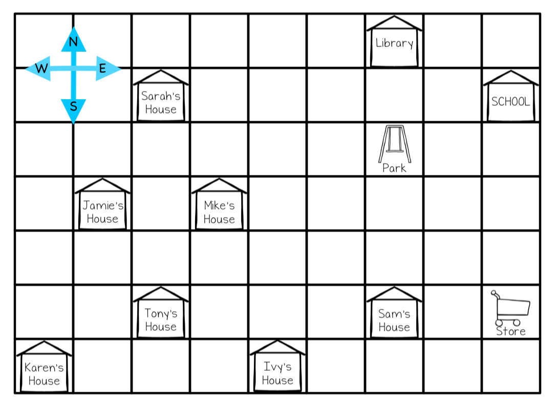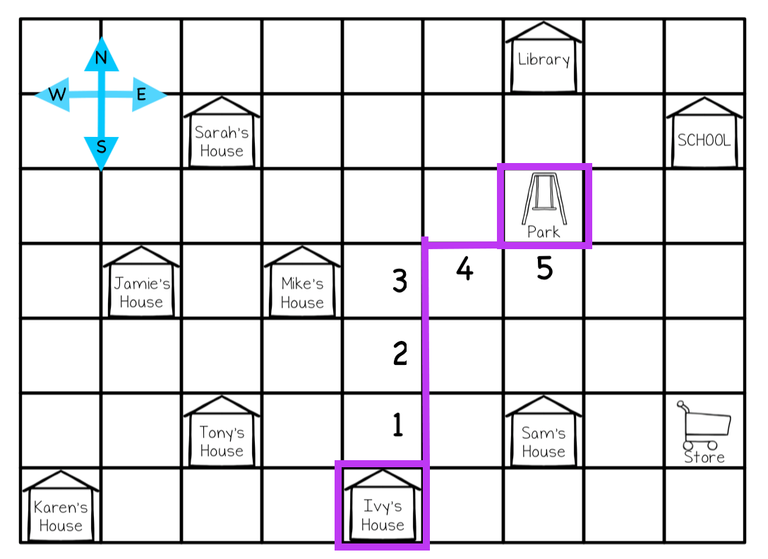 Start by going 3 square units up (North) and then go 2 units to the right (East).