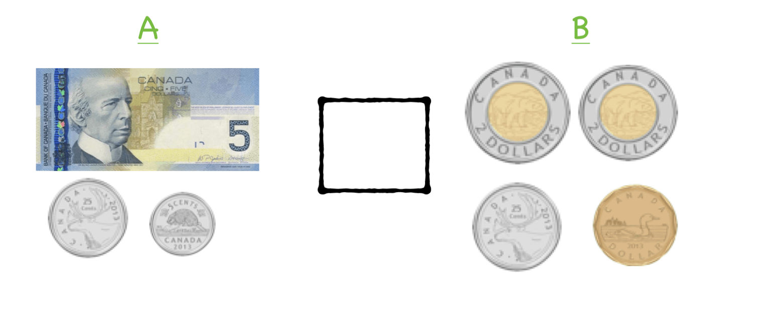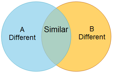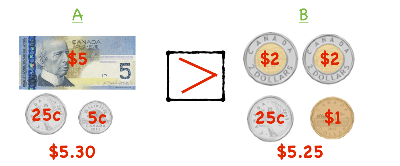 Is "A" greater than (>), less than (<), or equal to "B"?
