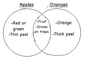 This Venn Diagram is comparing Apples and Oranges. It shows that APPLES can be red or green and have a thin peel. It shows that ORANGE are orange and have a thick peel. It shows that they BOTH are fruit and grow on trees.