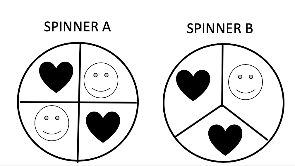 He most likely used Spinner B because there is more of a chance to spin the Heart with that spinner. This is because more of the spinner is covered with the Heart and less of the spinner is covered with the Smiley. Therefore, to spin the Heart is likely and to spin a Smiley is unlikely (less likely).