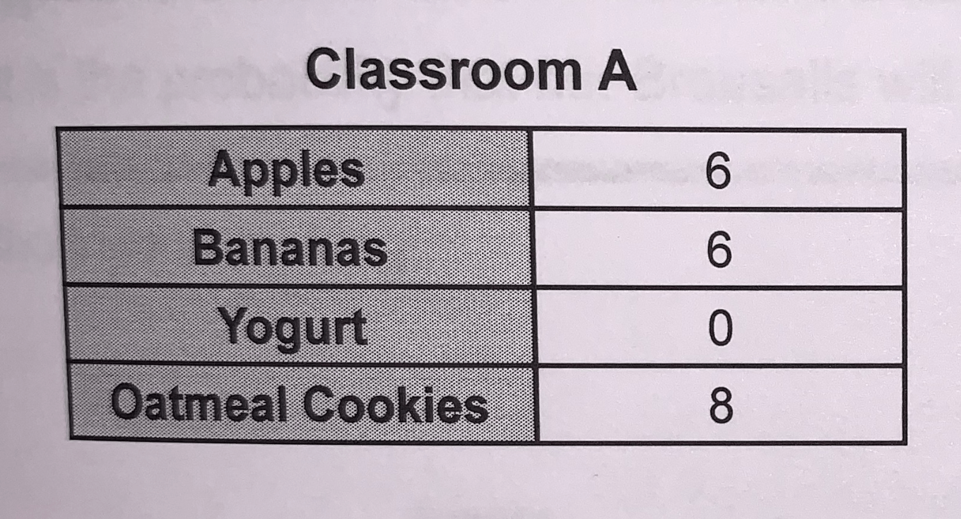 At Hillside Public School the Grade 3 classes are comparing their snacks. The table shows the results for one classroom: