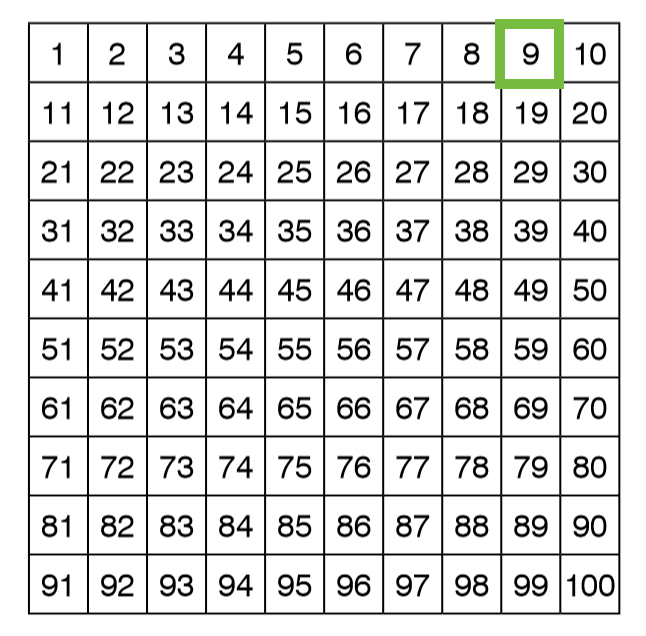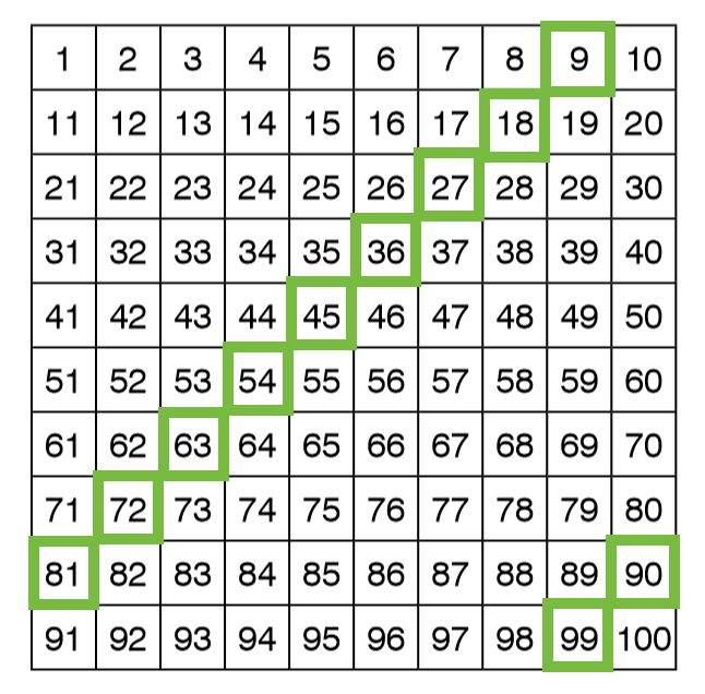 During math class Andrew was creating a number pattern on his hundreds chart. He starts at 9 and adds 9 each time. What pattern should he see?