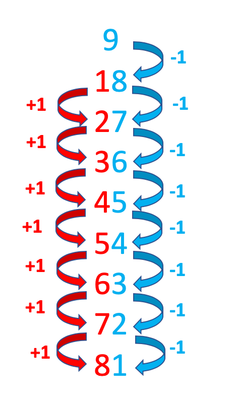 The numbers on the left side (tens column) go up by 1. The numbers on the right side (ones column) go down by 1 each time.